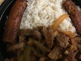 Steak with peppers, onions, tomato, rice, beans, sweet plantain and avocado.
