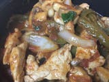 Chicken chunks with mushrooms, pepper, onions with lite marinara sauce.