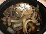 Stir-fried steak with onions, tomato, french fries white rice.